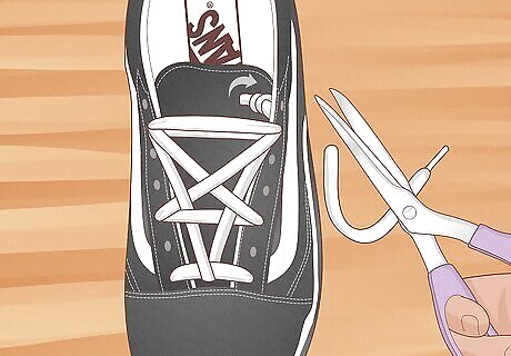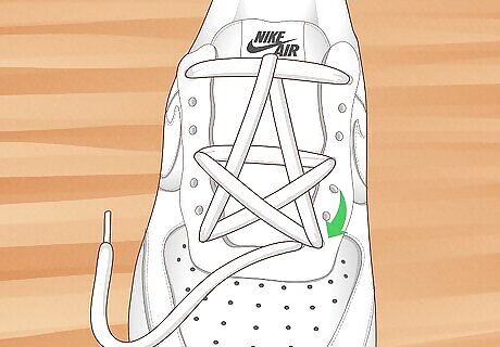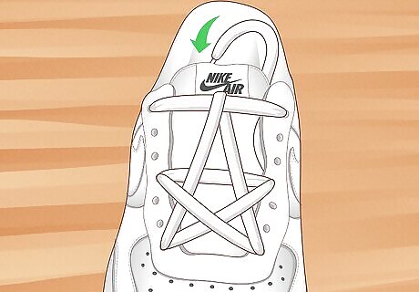 Tie a knot under the 6th right eyelet, then cut the excess lace. To secure your pentagram lacing into place, tie a knot in the shoelace as close as possible to the sixth eyelet on your right. You want this knot to be on the inside of the shoe so that it can’t be seen from the outside. Once the knot is securely tied and adjusted to your desired tightness, cut off any excess on the lace. If you don’t want to cut your laces (aka, you want to be able to adjust the tightness later), you can also tuck the excess under the sneaker’s tongue or insole (if there is one). Whatever works for you!