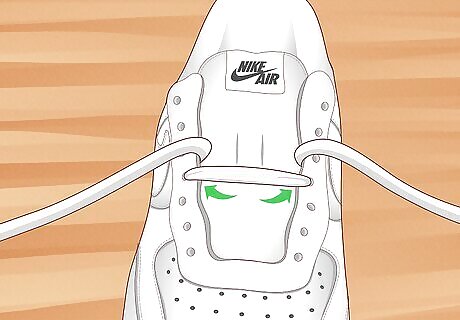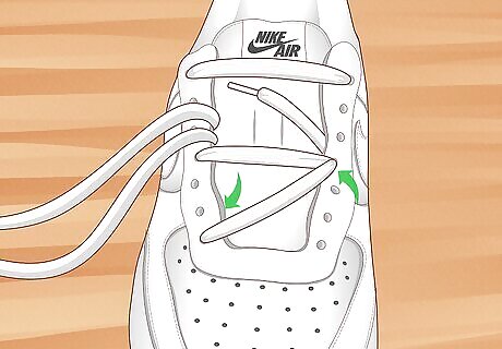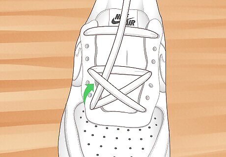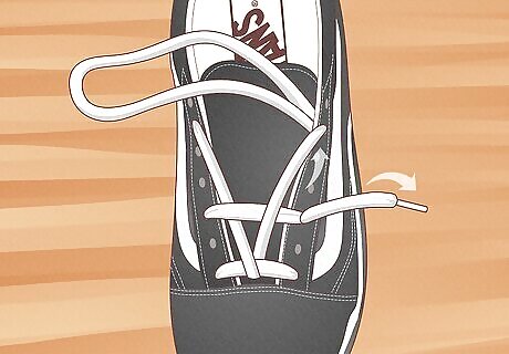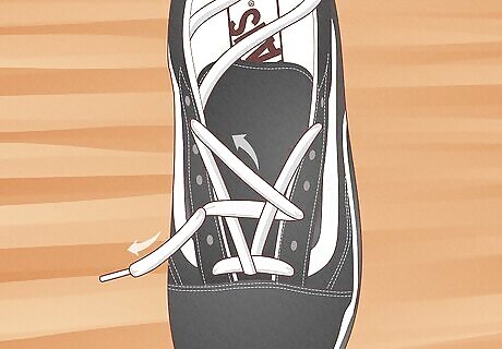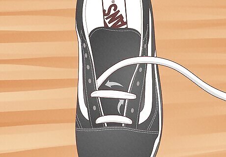 String the lace through the 6th left eyelet and wrap it around the bottom bar. Pull the end of the shoelace up over the tongue and, from the inside out, thread it through the sixth eyelet on the left. Then, pull the end of the shoelace toward the toe of the sneaker, making sure to weave it under the 3rd-eyelet bar. Take the lace over the bar nearest the toe, then wrap it around and under this bar. Again, make any necessary adjustments between each step to keep your laces taut and flat.