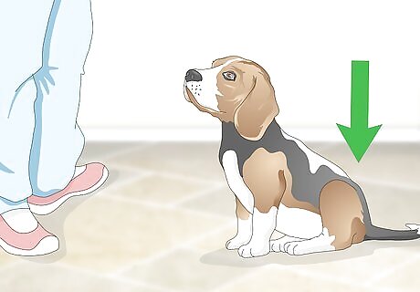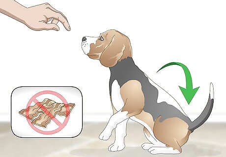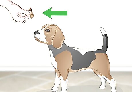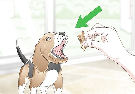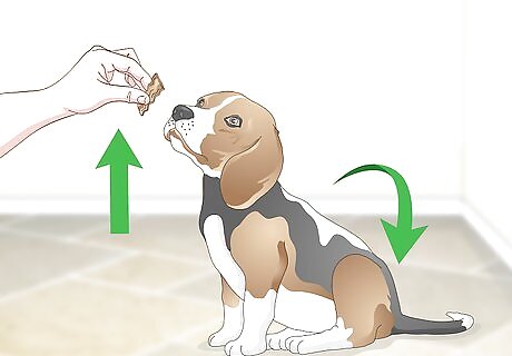 Raise the treat from your dog’s nose to above it to encourage sitting. If your dog seems to not care much about the treat and won’t sit when you put the treat above its head, try bringing the treat down in front of its nose first. Then bring the treat out and up above your dog’s head. Usually the upward movement of the treat will encourage your dog to sit so it can look at the treat. If this still doesn’t work, you may want to try a different kind of treat that your dog likes better.