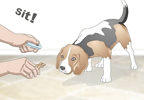 Repeat sit, click, and treat a few times. Do 5-10 repetitions of sit, click and treat before you start adding words. Your dog will start to associate its action of sitting with hearing the click and getting a treat.