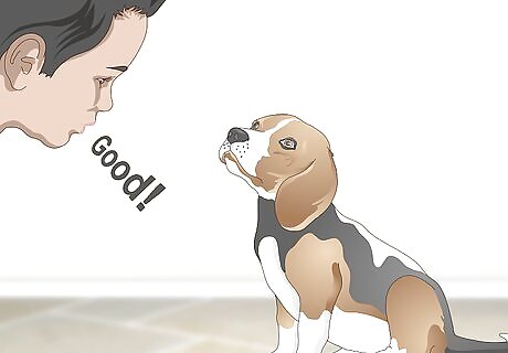 Add a praise word, such as “good!” when your dog sits. When your dog sits, say “good!” or “good sit!” as you click the clicker and give a treat. Repeat the sequence of command, sit, click, treat, and praise.
