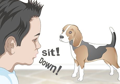 Add your verbal command, such as “sit” or “down” in a clear, firm voice. Choose a word that you will use every time you ask your dog to sit. Be sure to never change the word; doing so will confuse your dog. Use a clear, firm voice when you say the word, so the dog understands that you’re giving a command. Say the word, then use your lure treat or a hand gesture to encourage a sit at first. Continue doing this as long as your dog needs, until it can sit on its own with just your verbal command.