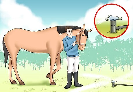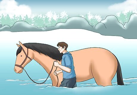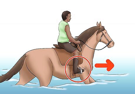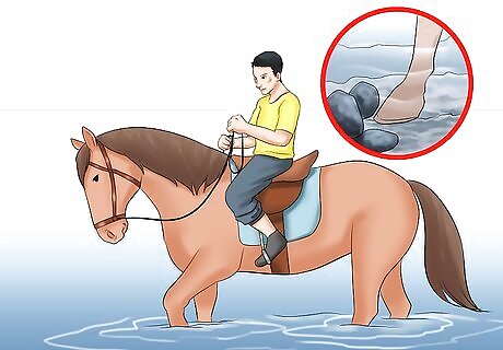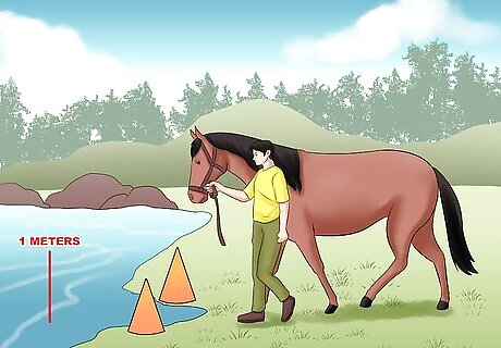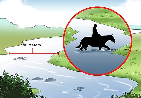 Check the water. The current should not be too strong and the water should not be too deep. Avoid walking your horse through water right after a heavy rain, or during the spring. Know the depth of the water before crossing. Water that reaches just above your knees is the ideal height for walking a horse through. Many well-trod horse trails that cross water have a post sticking up out of the water at their deepest point indicating the water’s depth.