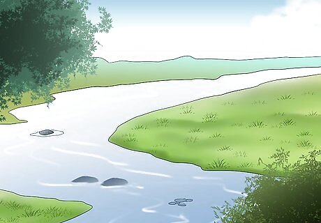 Use a route with a flat, broad bank. If the bank into or out of the water is steep, crumbling, or strewn with loose rocks and roots, it offers many more risks than a bank that is part of a flat, clear, well-trod route. The bank should be easily visible from the shore, free of dense foliage, and composed of sand or dirt.