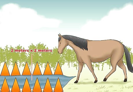 Trade the tarp with actual water. Once your horse can comfortably walk across the tarp with two cones on each side, remove the tarp and bring the horse to a large shallow body of water about three feet (one meter) deep. Place two cones in front of the water. Guide your horse into the water while standing at one side. Over time, you can gradually expose your horse to deeper waters, up to a level that reaches the middle of its chest. If your horse is hesitant to jump in water even one meter high, start out with a wide puddle just a few inches deep. Work your way up from there.