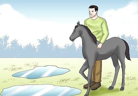 Start your horse out young. The best way to train a horse to cross water is to get it used to the feel of wading into water when it’s young. By the time the horse is an adult, walking through water will be second nature to the horse. A foal cannot, obviously, cross water at the same depth that a larger adult horse can. Train young horses in a wide puddle of only a few inches deep. This early training will build up the horse’s confidence and make it comfortable with being in the water. Gradually increase the amount of water the horse trains in.