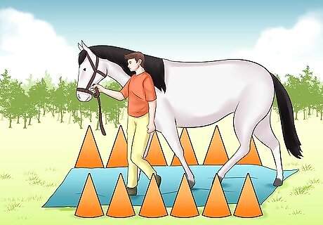 Prepare the tarp for the horse. Using a tarp to train horses to cross the water is simple and painless. The tarp will imitate the surface that the horse will encounter when walking through water. Lay a 6’ x 6’ (2 meters x 2 meters) tarp on the ground. Place an orange traffic cone on each corner. Walk across it several times so your horse can see that it is a safe and secure surface. The traffic cones are designed to keep your horse moving in a straight path over the tarp. Some trainers use a wooden rail instead. If you use a wooden rail to guide your horse, ensure it can be later moved and assembled easily at a site of actual water. This method can be used with a horse of any age, but is most appropriate for older horses who have not had much exposure to water.