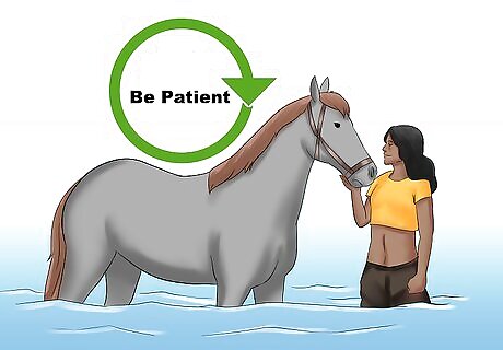 Help your horse conquer its fear. If your horse is truly uncomfortable with water, walk it and train it near a garden hose. After your horse can adequately perform all your commands near the garden hose, turn the hose on, allowing just a trickle to come out. Continue training near the garden hose, slowly increasing the flow of water from the hose over time. Once the water is coming out of the hose at its maximum rate, expose your horse to more direct sources of water such as a sprinkler system. Start training your horse at a distance from the sprinkler that the horse is comfortable with, and gradually move your horse toward the sprinkler during training sessions. Teach the horse that water is fun. Lead your horse into deeper water, especially on hot summer days. Many horses enjoy splashing and playing in pools and rivers. When your horse has a positive association with water, getting it to walk through water will be easy.