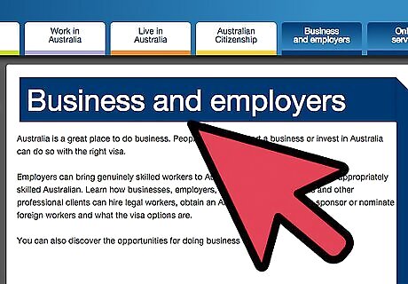 Apply for a business visa. There are several types of business visas, usually available to people who are entrepreneurs or investors and seek to enhance the Australia economy. You can also seek a visa to train or conduct business for a short period of time. If you are planning a business visit, you will need to apply for an ETA or eVisitor visitor visa before being granted a subclass 956, 977 of 651 visa. Visit www.immi.gov.au/skilled/business/business-visit-visa-options.htm to find out how to apply. You will need to apply for a short stay business visa if you are not eligible for an ETA or eVisitor via. Visit the link above to apply for a subclass 456 visa.