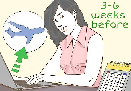 Book your flight 3-6 weeks in advance of your trip. Flight prices tend to get more expensive closer to the date that you plan on leaving. Start looking for flights about 2 months before you depart to get the lowest prices for air travel. Continue checking prices for the next few weeks to see if the price changes. Track flight prices on Google Flights to see when tickets are cheaper or more expensive. Turn on notifications for the days you plan on traveling to get alerts when prices change.