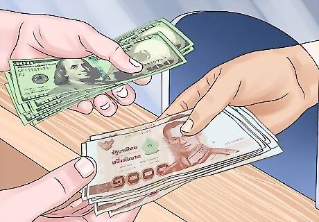Exchange your currency for the Thai baht. Most establishments and vendors require cash in Phuket. You can exchange your currency when you get to the airport, or you can use the ATMs when you get there. Be sure to inform your bank you are traveling internationally before you go, so they don’t put any limits on your account. Some restaurants, shops, and hotels do accept major credit cards like Visa and MasterCard. For example, US $1 = 30 baht. Getting currency at the airport may get expensive. ATMs often charge a foreign-transaction fee on top of conversion charges.