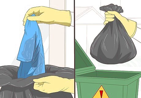Remove any contaminated clothing in case of a liquid spill. If you have spilled liquid ammonia on your clothing or are with someone else whose clothes have been contaminated, remove the affected clothing as quickly as possible. If you can, put on a pair of gloves to prevent any of the ammonia from getting on your hands. Place the clothing in a sealed plastic bag (such as a garbage bag) and put it in a secure location until emergency personnel arrive. If the contaminated clothing is an article that is usually pulled off over the head (such as a T-shirt or sweater), cut the item off with a pair of scissors if you can. This will prevent the ammonia from coming into contact with the face and eyes. Don’t handle the bag with the contaminated clothing in it any more than you have to. Place it somewhere out of reach of children or pets, such as in a locked cabinet or on a high shelf. Let emergency personnel know where it is.