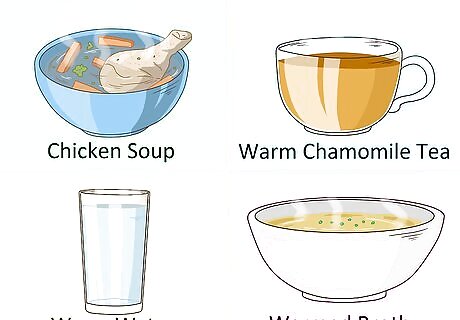Offer your infant warm liquids to help aches and congestion. If they are six months or older, your infant can have chicken soup or warm juice like apple juice. Warm clear liquids can relieve sore throats, congestion, aches, and fatigue. Make sure the liquids are not hot, but warm. They should not scald or hurt your baby. Try testing the temperature on your wrist using the same technique that you use with a bottle.