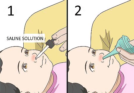 Use a combination of saline drops and suction to remove excess mucus. Tip your infant's head back and squeeze drops of an over-the-counter saline solution into their nostrils. Read the instructions to see how many drops you should use based on your baby's age and weight. Saline drops will help thin out the mucus and make it easier to remove. Have your baby lay flat on their back for 2-3 minutes. Then use a rubber bulb to suck out the loose mucus. Boil the bulb for 3-5 minutes before you use it to clean and sterilize it. Allow it to cool completely before using it on your child. Before using suction, squeeze the bulb to release any air. Gently insert the tip of the syringe into your baby’s nose. Only place the syringe inside the nose ¼ to ½ inch (0.64 to 1.27 cm). Angle the tip towards the back and side of the nose. Squeeze to suck up the mucus, then gently remove the syringe from the baby’s nostril. The best times to do this are before feeding your baby or putting them to bed.