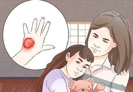 Identify the severity of the burn. There are three "severities" of burns — first degree, second degree, and third degree. Examine the area of the burn to get an idea of the severity and to assess whether or not you need to bring your child to the hospital. First degree burns affect the outermost layer of skin only, causing pain, redness, and/or swelling. Generally, first degree burns are not too concerning and do not need to be seen by a doctor. Second degree burns affect the outermost layer of skin as well as some of the inner layers. For this reason, they may cause blistering in addition to pain, redness, and swelling. Second degree burns greater than two to three inches wide require evaluation from a doctor right away. Third degree burns travel through the full thickness of the skin. They may cause whitened or blackened skin, and may leave the skin feeling numb. Third degree burns always require evaluation by a medical professional. It is also important to note the location of the burn. Burns on the hands, feet, face, buttocks, or over a joint and/or genitals are more serious and, if in doubt, warrant being evaluated by a medical professional.