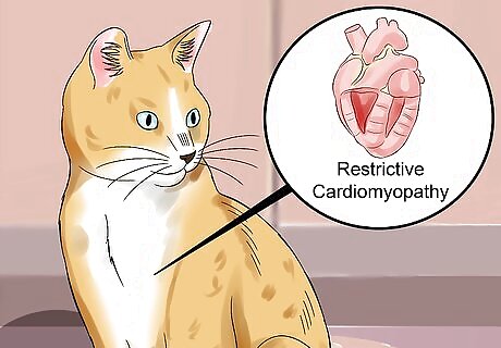 Understand the causes of cardiomyopathy. There are several reasons why a cat might develop disease of the heart muscle. These include: Genetic predisposition: Certain breeds (especially the Main Coon) get heart disease more often, which is then passed down from parent to kitten when they have babies. Underlying disease: Conditions such as overactive thyroid glands, acromegaly (too much growth hormone), or high blood pressure place extra strain on the heart and can push it into developing cardiomyopathy. Dietary deficiency: A lack of taurine, a type of amino acid, in the cat's diet can affect its heart. However, most cats eating high-quality commercial cat food should not have this deficiency. This deficiency causes the heart to lose elasticity, which is known as dilated cardiomyopathy. Spreading Disease: A spreading disease, such as lymphoma (blood cancer), can get in to the heart muscle and cause it to have a hard time functioning correctly.