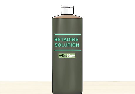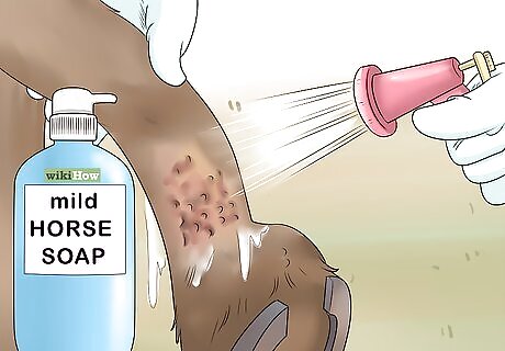 Wash the area with Betadine. This iodine-based antiseptic is very effective at clearing up wounds. You can purchase a premixed Betadine solution. Squirt or spray the solution onto the wound using a bottle or syringe. You do not need to rinse after application. Do not use chlorhexidine scrubs or solutions on the wounds, as it is toxic to new cell growth and repair. This will delay your horse's healing process.