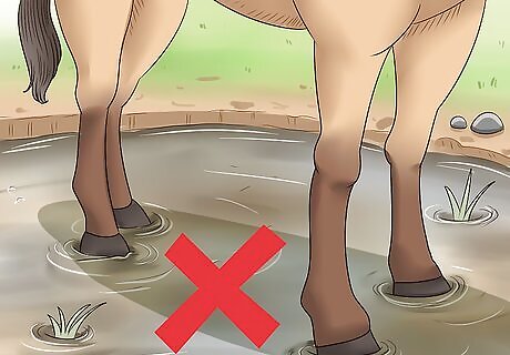Keep the horse out of the mud. Ensure that the horse remains in clean, dry conditions outside of the stall as well. Avoid taking it through any muddy terrain while it is healing. If conditions are dry, you can let your horse out to pasture while it heals. If conditions are wet, do not keep your horse cooped up in the stall. Instead, hand walk it or otherwise keep an eye on it to ensure it stays out the mud. Alternatively, you can wrap a Telfa non-stick pad over the ointment and then cover it with a light Vetwrap while your horse is turned out. Remove the cover as soon as your horse is back in its stall.