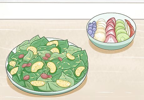 Eat a variety of fruits and vegetables at every meal. Getting plenty of vitamins and minerals is essential to any diet. However, if you're struggling with symptoms of hypothyroidism, including fatigue and depression, eating an array of brightly-colored foods can help give your body a boost that may help you feel a little more energized. Differently-colored fruits and vegetables contain different vitamins, so try to mix and match as many colors as you can each day. For instance, you might try eating a salad made of sliced cucumber, diced tomatoes, and fresh basil with your lunch. Then, at dinner, have a serving of wilted spinach and roasted carrots.
