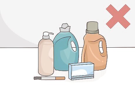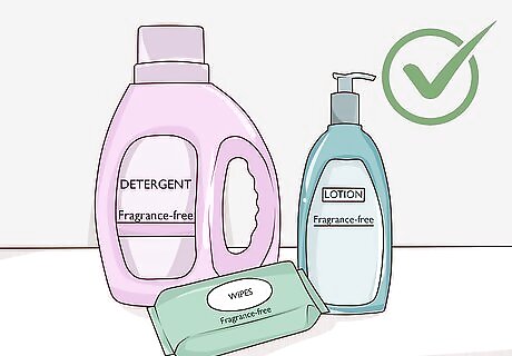 Use mild, fragrance-free wipes, detergents, and lotions. Products with a lot of ingredients or fragrances in them can be triggers for eczema. Look for wipes, soaps, laundry detergents, and lotions or creams that say “fragrance-free” on them to avoid making your baby’s eczema worse. Products like these are often labeled “free” or “clear.”