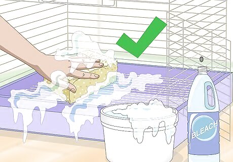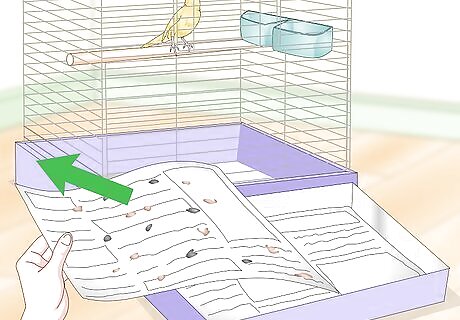 Keep your bird's cage clean. Cleaning your bird's cage regularly is central to keeping your birds parasite free. It removes their waste, excess food, and any other germs and bacteria that accumulates on the bird's supplies. Take the time to do light cleaning every day, such as changing the paper at the bottom of your bird's cage. However, be sure to do a thorough cleaning of the cage, top to bottom, every week. You should regularly sterilize your bird's cage, perches, toys, food dishes, water dish, and nesting areas.