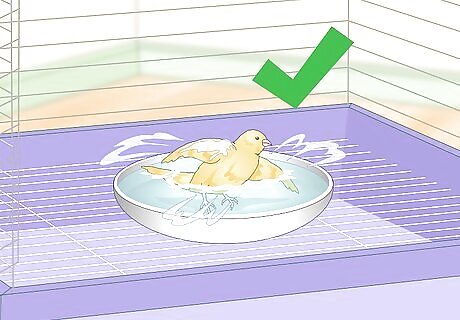 Give your bird the ability to bathe. In addition to cleaning your bird's cage, you should allow it to clean itself. Place a shallow dish of warm water at the bottom of your bird's cage every day. You can also provide a dish of Diatomaceous earth for your bird to bathe in to help eliminate lice and mites. If your canary doesn't jump on the chance to clean off in a shallow dish of water, consider misting it with warm water. Some birds just prefer this method of bathing.