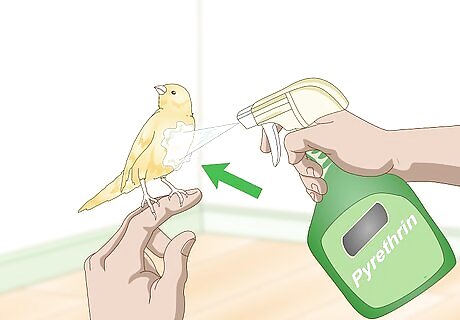 Apply a bird-safe insecticide to your canary. Once your veterinarian has established what type of infection your canary has, they will suggest an insecticide to give to the bird. In some cases, such as a lice infection, the bird will be given a broad spectrum antiparasitic, such as carbaryl dust, pyrethrin spray, or ivermectin. Follow your veterinarian's advice about how to give your bird this medication, including how much and how often to apply them. For instance, you may need to give a measured amount of a 1% solution of ivermectin to your bird at 10 days, 20 days, and 30 days after the vet visit.