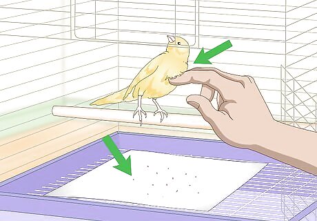 Watch your canary for signs of continued infection. Once you have begun treatment, you should keep an eye on your bird for signs of recovery. Depending on whether your bird has a mite or lice infection, these signs will differ. If your bird has a blood mite infection, put a clean white paper towel in the bottom of your bird's cage every morning. As it recovers, you should see fewer and fewer red dots covering the bottom of the cage. If your bird has lice, you will need to inspect the bird's body on a regular basis to ensure that the lice have been eliminated. Look under the bird's wings and all around its body for lice or lice eggs.