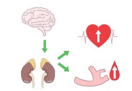 Research your body's natural stress response. A panic attack happens when your body's stress response activates for some unidentified reason. Take some time to familiarize yourself with what your body is doing during a panic attack so that you can properly counter the stress response symptoms. For example: When your brain's stress alarms go off, your nervous system floods your body with adrenaline. This causes your heart rate and blood pressure to go up, your senses to become sharper, and your blood sugar levels to surge. Once you learn to recognize the stress response, you can act quickly to counter it with relaxation techniques, such as doing deep breathing exercises, visualizing a peaceful scene, or doing some gentle stretches.