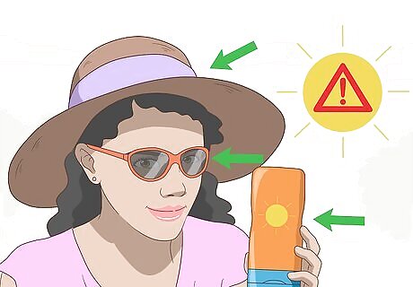 Protect your skin from the sun while you're outdoors. Although sunlight can help your psoriasis in small doses, it's very harmful if you spend a lot of time in the sun. Sunburn can trigger your flare-ups, so protect your skin! Take the following precautions when going outdoors: Wear a large hat to protect your scalp and face. Apply a fragrance-free broad-spectrum sunscreen, especially to skin not affected by psoriasis. Wear sunglasses to protect your eyes.
