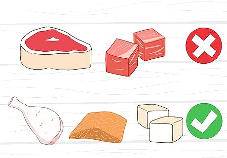 Eliminate red meat from your diet. Red meat can trigger flare-ups because it causes inflammation in your body, so it's best to avoid it. Instead, choose leaner proteins like chicken, fish, tofu, and beans. If you enjoy eating red meat, choose lean cuts of meat like sirloin, round, or loin. Before you cook the meat, make sure you cut off as much fat as possible.