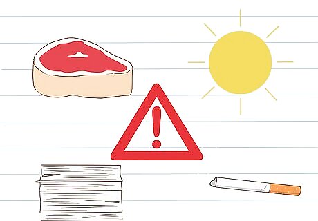 Avoid your psoriasis triggers to prevent it. Stay away from activities, foods, and substances that aggravate your psoriasis. When you have a flare-up, write down what you ate and what you were doing before it occurred. This will help you find your triggers. While some of your triggers will be unique to you, there are common triggers to avoid: Injuring your skin, e.g., by scraping yourself or scrubbing your skin too aggressively Over-exposure to the sun Stress Smoking Certain infections, such as strep throat, bronchitis, or tonsillitis. Protect yourself by washing your hands regularly and avoiding contact with sick people as much as possible.