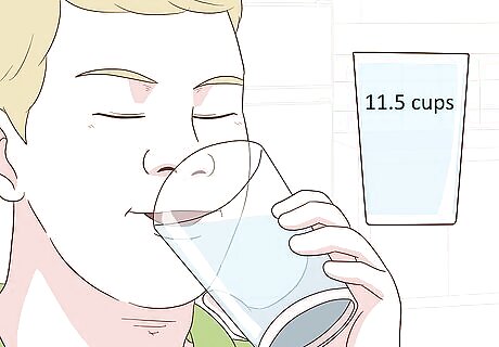 Stay hydrated by drinking at least 11.5 cups (2.7 L) daily. Water helps flush out your system and is part of your body's natural detox process. How much water you need daily will depend on your age, gender, and activity levels. If you feel thirsty or have dark urine, increase your fluid intake. In general, women need about 11.5 cups (2.7 L) of water each day, while men need 15.5 cups (3.7 L) of water daily. You don't have to just drink water! Fluids like tea, juice, soup broth, smoothies, etc. all contribute to your water intake.
