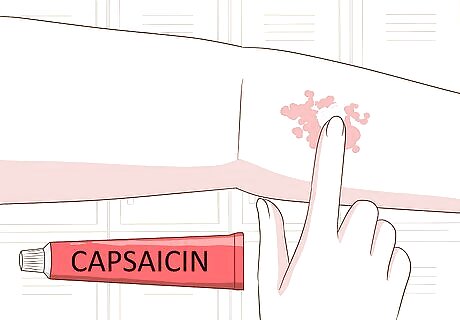 Apply capsaicin cream for symptom relief. Capsaicin, which is found in cayenne peppers, can relieve itching, scaling, irritation, and redness. You can apply an over-the-counter capsaicin cream directly onto skin affected by psoriasis. Use the cream once or twice a day. Capsaicin cream can cause burning, stinging, itching, and redness right after application. However, these side effects usually subside soon after application. Stop using the cream if the side effects bother you. Do a patch test by putting a little capsaicin cream on a small area of your skin before using it to treat a large plaque. You may need to wait up to 24 hours before you see any negative reactions.
