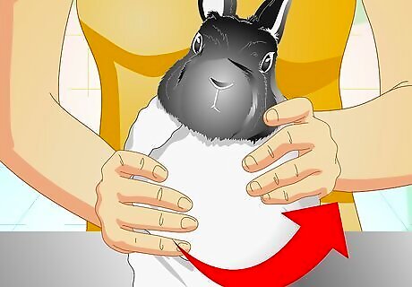 Get the rabbit into position. Once your friend is holding the wrapped up rabbit, you'll need your friend to get him into position. It's best to have your friend cradle him while also restraining him to protect your rabbit from squirming and/or falling. Ensure that the rabbit is held in place in your friend's lap. Lay the rabbit belly-up and upside down, with his head pointed toward your friend's knees. Laying a rabbit upside down with his head lower than the rest of his body puts him into a calmer, "trance-like" state. However, some behaviorists advise against putting rabbits in the 'trance' state as they only do this when they are extremely frightened -- the fact that they stay still when belly up is a desperate attempt to make a predator overlook them. Have your friend use one hand to support the rabbit around his chest. This will help reduce the chances of him squirming free while you work.
