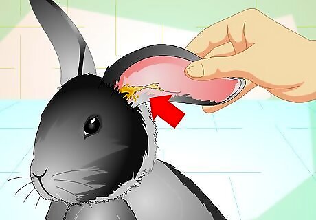 Check the ears for infection. While you're grooming your rabbit, it may be a good idea to check his ears for signs of infection. Ear infections are quite common among rabbits, so check on his ears periodically to ensure that your rabbit is in good health. If you observe any signs of an ear infection, it's important to take your rabbit to the vet as soon as possible. Common signs of an ear infection include: pain/sensitivity to touch frequent head shaking redness/swelling, especially in the external ear canal thick, white fluid in the ear canal (which may sometimes be creamy in texture) excessive ear wax odor in and around the ear crusts forming around the ear canal digging at the floor and/or holding down the ear (a sign of pain) lack of appetite or interest in food patchy hair or loss of hair around the ears scaled skin around the ear canal