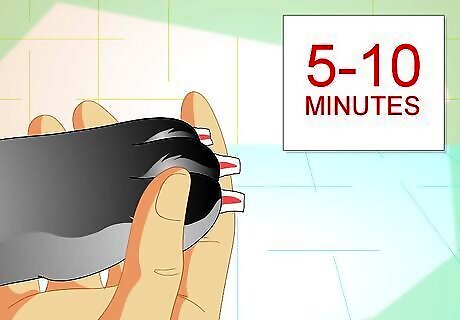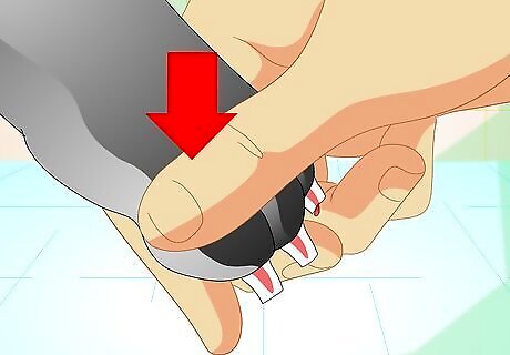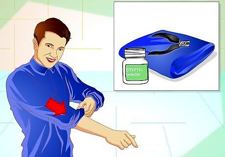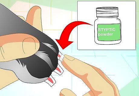 Use a styptic product. Styptic products stop the bleeding when you've accidentally drawn blood. If the quick was cut and won't stop bleeding from pressure alone, you'll need to apply a styptic product to the injured nail. If you're using a styptic powder, wipe away the blood and press a pinch of the powder directly into the tip of the bleeding nail. If you don't have a styptic powder on hand, you can improvise by using cornstarch or flour in the same way you would apply a styptic product. Some people find that gently pressing an injured nail into a bar of mild bath soap can help stop the bleeding.