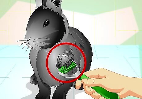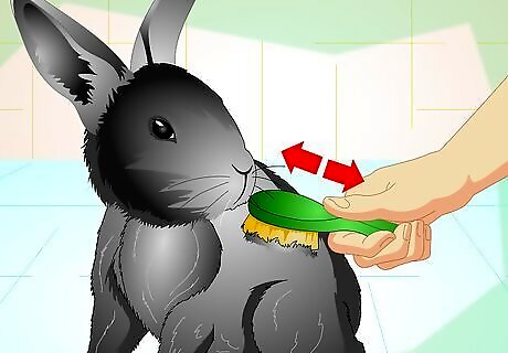 Brush your rabbit's coat. Rabbits shed their coat every three months. Rabbits will try to lick their coats clean like a cat, but unlike cats they cannot vomit up hairballs. If you don't brush your rabbit regularly he may develop a hairball blockage in his stomach, which could cause him to starve to death. Brush your rabbit at least once every week. Choose a bristle or pin brush to avoid injuring your rabbit's skin. Brush in the natural direction of hair growth - typically, this will be from head to tail.