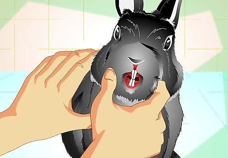 Examine the teeth. A rabbit's teeth will continue to grow, just like his nails. Usually access to chew toys will help manage the growth of teeth, but occasionally an injury occurs that makes it difficult for your rabbit to chew his wooden toys or eat his food. Check his teeth periodically to make sure they're in good health. You'll probably only be able to see the front teeth (incisors) in your rabbit's mouth. The incisors should be even. That means both top teeth should be the same length, and so should both bottom teeth. Make sure there are no cracks in the teeth, no loose teeth, and no food or debris trapped between the teeth. If you observe any problems, contact your vet immediately, as your rabbit may need medical help.