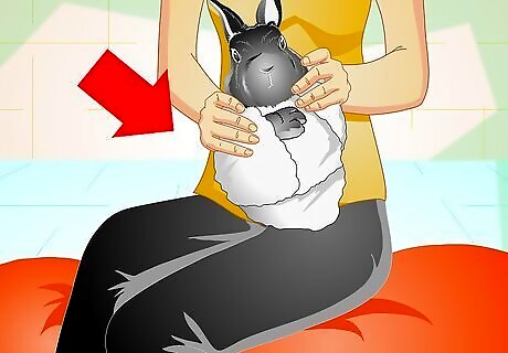 Have a friend hold your rabbit. It will be incredibly difficult to attempt to trim your rabbit's nails alone. You probably won't be able to hold the rabbit's body, find the quick, and trim the nails on your own without dropping or injuring the rabbit, so it's best to have someone assist you. Wrap the rabbit in a clean towel with his paws sticking out. Make sure your rabbit's head is not covered by the towel, as this may frighten him and/or affect his ability to breathe. Make sure your friend is sitting down while holding the rabbit. If the rabbit squirms out of your friend's hands and falls while she's standing, the rabbit may become injured.