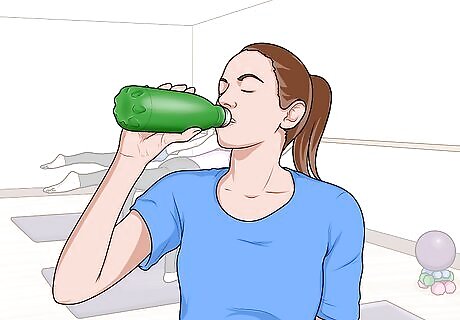 Bring water with you to your workout. As with any workout or exercise routine, you want to stay adequately hydrated. Even if you don't think barre will work up a sweat, be prepared to work hard and need some fluids. It's a good idea to have a water bottle with you during your barre workout to help keep you hydrated during this routine. In addition, follow up your workout with more water. Bringing a 16–30 oz (0.5 to 1 litre) water bottle to an hour barre workout should be sufficient. In addition, you shouldn't need any type of sports drink or electrolyte drink for this particular exercise. Also, make sure you stay adequately hydrated throughout the entire day. In total, you should aim for about eight to 13 glasses of water daily.