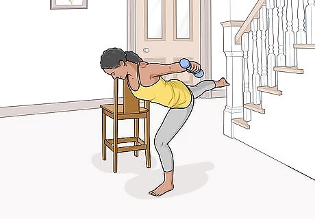 Work on your upper back and arms with the rear fly and arabesque Lift. This barre exercise will help strengthen multiple areas of your body including your arms and legs. Start by: Stand next to a sturdy chair so your hip is perpendicular to the back of the chair. Place your right arm on the top of the back of the chair. In the left hand, hold a light dumbbell. Feet should be hip-width apart. Slowly lift your right leg (leg closest to the chair) behind you keeping your leg straight and your toes pointed. As you do this, slowly bend your left knee slightly and hinge forward at your hips so your face and torso are facing the floor. Lift your left arm with the dumbbell out to the side. Lower both your arms and return to the standing position. Repeat 20 times on each side.