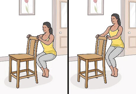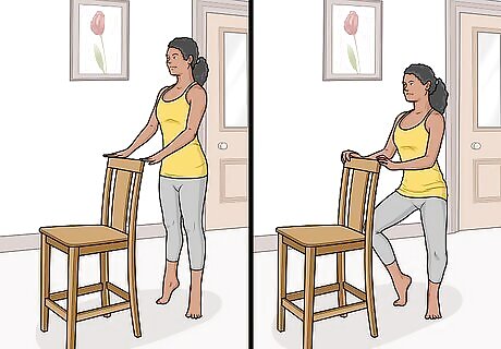 Strengthen glutes and feet with the parallel plié pulse. This particular barre exercise works the back of your legs, your glutes, and your feet. Start this exercise by: Stand behind the back of a sturdy chair. Place your hands on the top of the back of the chair and keep feet hip-width underneath you. Lift yourself up onto your "tippy-toes" and begin to squat down by lowering your hips down towards the floor. Keep your inner thighs and knees pressed together as you lower your hips. Slowly raise back up to the starting position. Repeat this exercise 20 times or as many times as you can.