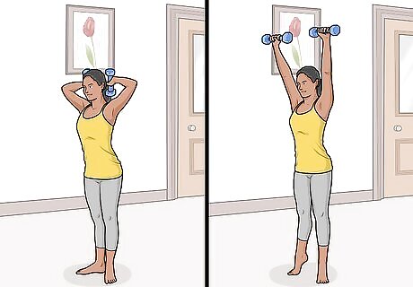 Tone your triceps with the tricep shaver. This particular barre move focuses on toning and strengthening your triceps in addition to working on balance. Holding one dumbbell in each hand, bend your arms behind your head at a 90 degree angle. Your feet should be hip-width apart and toes point at a 45 degree angle away from your body. While holding your abs tight, push up through your toes until you're on "tippy-toes." As you push up, also lift your hands up towards the ceiling until your arms are straight. Slowly lower your arms and legs back down to their starting positions. Repeat this exercise 20 times total or as many times as you can.
