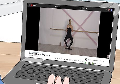 Look for local barre studios in your area. If you're interested in trying a barre workout, the best place to start is to find a barre studio in your area or a local dance studio that offers barre classes. Ask friends, family, and coworkers for recommendations. Although there are ways to do barre workouts at home, these moves are not your traditional exercise or strength training exercises. It'll be beneficial to go to a class to watch other students and to get guidance from the instructor. Also, barre classes can be pricey. Research a couple of studios to see the range of prices. In addition, some studios will offer discounts if you purchase a longer-term membership instead of individual classes. Consider looking for barre studios that have classes tailored to your needs. You may find specific barre classes for: beginners, women who are pregnant, those who are senior citizens or those who are advanced practitioners. Ask the studio about the style of classes they offer. ask the studio or facility about the style of the barre class they offer, whether it is fast paced or slow paced, and whether the instructor has a dance background. Knowing the type of music that is played can give you a good idea of how the class will feel and whether it suits you.
