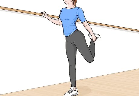 Tone your legs with the relevé plié. This barre exercise tones your inner thighs and the bottoms of your feet. Start this exercise by: Stand behind a sturdy chair with feet hip-width apart and toes pointing away from your body at a 45 degree angle. Hold onto the back of the chair with both hands. Rise to your "tippy-toes" and then slowly bend your knees out away from your body at a 45 degree angle (in a plié motion). Only lower about half way down. Straighten your legs back up and then lower down to flat feet. Repeat this exercise 20 times or as many times as you're able.