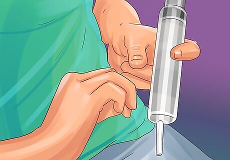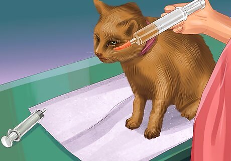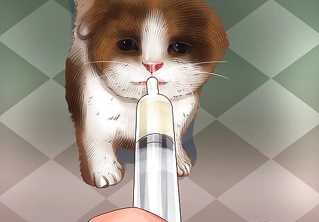 Insert food into the tube with a syringe. To tube feed a cat, you feed the food into the tube through a syringe. Your vet should provide you with a syringe or advise you where to purchase one. Draw the correct amount of food from the syringe and then feed it into your cat's feeding tube. You usually measure the food first. Most syringes have measurements on the side you can use. You can also measure out the food first using measuring cups and then draw it into the syringe.