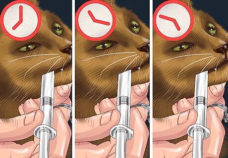 Feed your cat several times throughout the day. Cats do not receive all their daily food at once with tube feeding. Food is administered in small amounts throughout the day. Make sure you know how much food to feed your cat and at what intervals to feed it. The timeframe and amounts of food depend on your cat's specific condition, so talk this over with your vet.