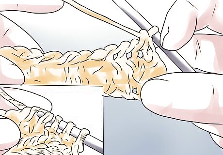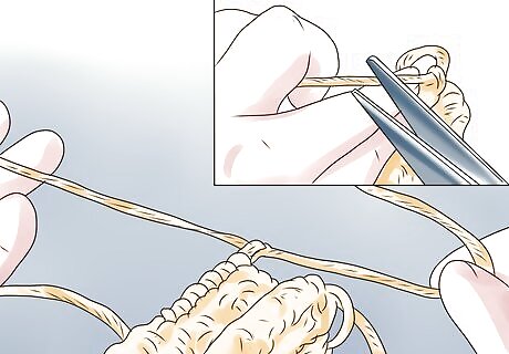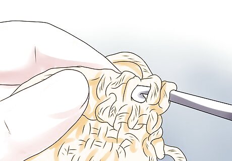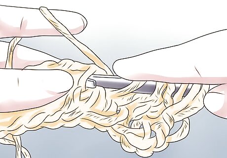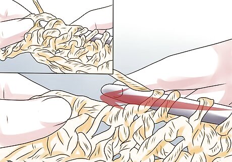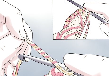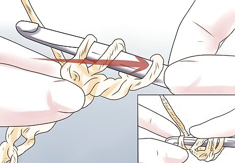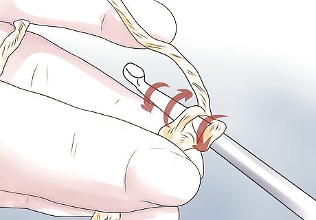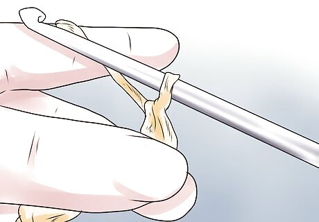 Create a foundation chain. Attach the yarn to your hook using a slipknot, then work a foundation of 10 standard chain stitches. You can change this number of chains according to your needs. This example uses 10 chain stitches, but you should alter this number based on your pattern's instructions or on the desired length of your work. To make a slip knot: Create a loop, passing the tail end of the yarn beneath the attached side. Push the attached side of the yarn up through the bottom of the loop, creating a second loop in the process. Tighten the first loop around it. Insert your crochet hook into the second loop. Pull on the tail end of the yarn to tighten the second loop onto the hook and complete the knot. To make a standard chain stitch: Yarn over the tip of the hook once. Pull this yarn-over through the loop already on your hook. This completes one chain stitch.
