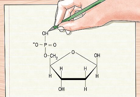 Attach a phosphate group. A phosphate groups has 1 hydrogen, 1 phosphate, and 4 oxygens. The phosphate group attaches to the 5’ carbon of deoxyribose to make up one block of “sugar-phosphate” that makes up the backbone. This backbone of DNA repeats with every phosphate group attaching to the 5’ end of deoxyribose and forming phosphodiester bonds with the 3’ end of the next deoxyribose molecule. Just as we generally read from left to right, DNA is always read from 5’ to 3’. The terminal phosphate group is at the 5' end and the terminal hydroxyl group is at the 3' end.